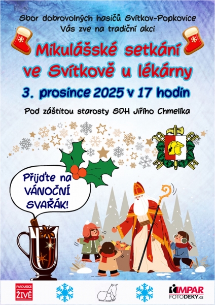 Ve středu 3.12.2025 od 17.00 hod Vás srdečně zveme na tradiční Mikulášské setkání ve Svítkově u lékárny, které proběhne pod záštitou starosty SDH Jiřího Chmelíka.